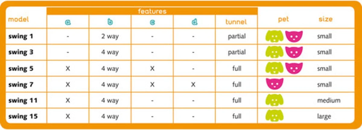 Voor katten en puppy’s raden we Swing 1, 3 of 5 aan. Voor middelgrote en grote honden, maar ook voor grote katten, zijn de Swing 11 of 15 modellen meer geschikt. Het model Swing 7 is daarentegen uitgerust met een magnetisch systeem en is perfect voor katten.