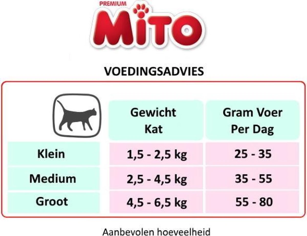 Voor volwassen katten van alle rassen. Samengesteld door katten voedingsdeskundigen. Zonder in te leveren op kwaliteit en smaak, biedt Mito een gunstige prijs door zijn directe verkoopstrategie.