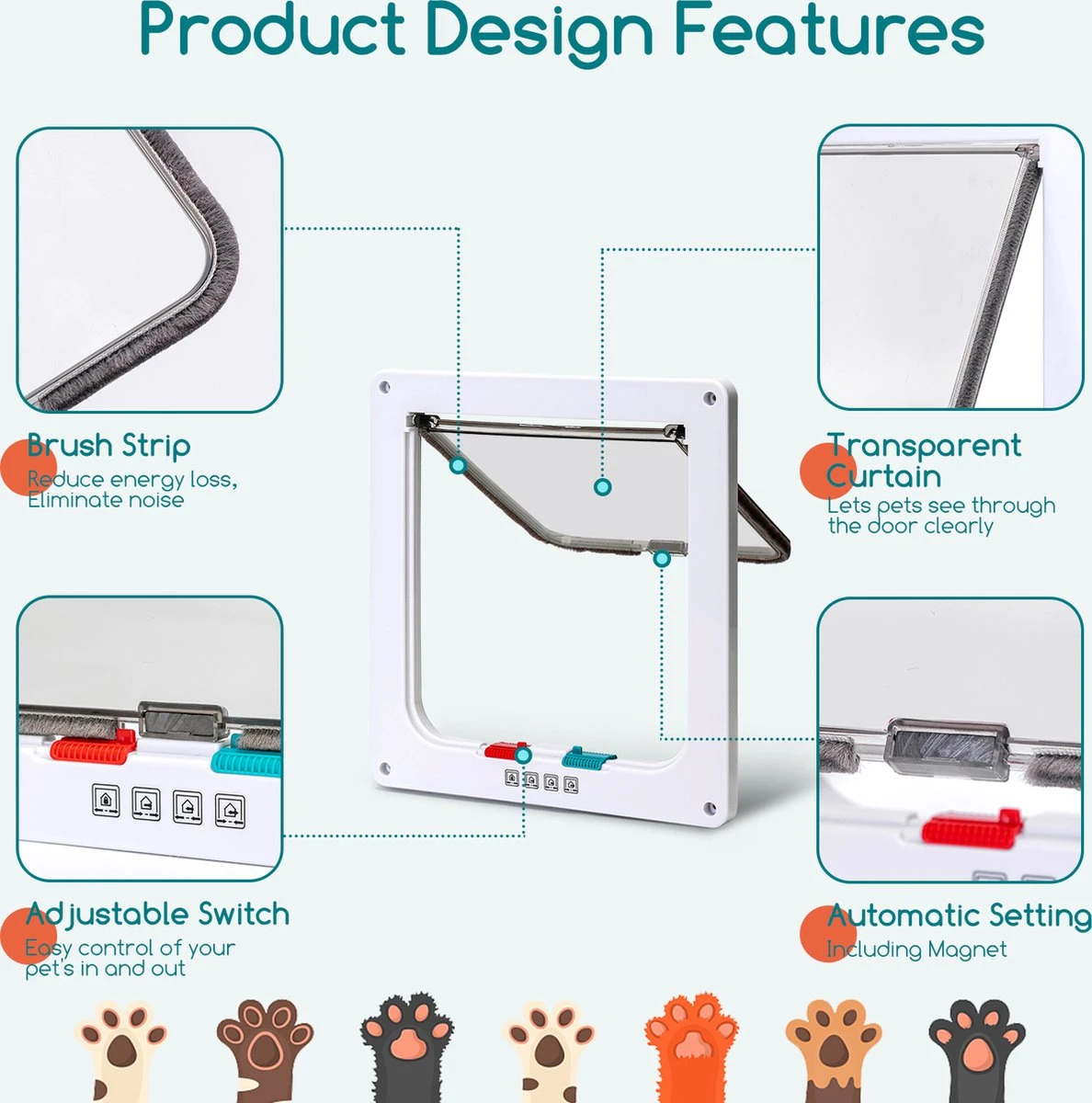Het kattenluik is gemaakt van duurzaam ABS-kunststof, eenvoudig te reinigen en werkt geruisloos met een borstelstrip. Het magnetische slot zorgt ervoor dat de kattenluik na gebruik weer in zijn oorspronkelijke positie komt. Winddicht en beschermt tegen tocht. Zodat het binnen niet gaat vriezen in de winter of stormachtige herfst.