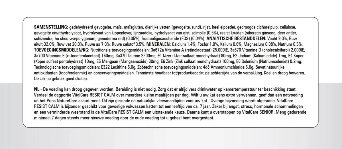 Prins VitalCare Resist 10 kg. Bewust gezonde voeding voor de gevoelige volwassen kat. VitalCare Resist is een hoogwaardige voeding met kruiden. Deze mix van kruiden maakt de voeding zeer geschikt voor katten die wat extra’s nodig hebben. Katten die ziek zijn geweest of herstellende zijn na een operatie, kunnen een verminderde weerstand hebben. Maar ook angst, stress en hormonale schommelingen kunnen de weerstand verlagen, waardoor de kat gevoeliger wordt voor infecties. De kruiden zorgen voor een extra ondersteuning van het immuunsysteem en verhogen de weerstand van uw kat. Hierdoor verbetert de algehele conditie van uw kat! Dit uit zich in een gezonde glanzende vacht en een optimale spijsvertering. Dit product bevat urineverzurende stoffen voor een gezond milieu in de blaas. Let op, er zijn meerdere factoren die hierin meespelen, zoals bijvoorbeeld stress, inname vocht, ophouden urine, aantal kattenbakken in huis (stelregel: aantal katten plus 1). Prins VitalCare Resist is speciaal geschikt voor gevoelige katten. Na het verdwijnen van de klachten kunt u door middel van mengen, overstappen op een andere voeding uit het VitalCare assortiment. VitalCare Resist kan zonder problemen langdurig worden gegeven. Samenstelling: Gedehydreerd gevogelte, maïs, maïsgluten, dierlijke vetten (gevogelte, rund), rijst, heel eipoeder, gedroogde cichoreipulp, cellulose, gevogelte eiwithydrolysaat, hydrolysaat van kippenlever, lijnzaadolie, hydrolysaat van gist, zalmolie (0.5%), resist kruiden (siberean ginseng, deer antler, schizandra, ho shou wu/polygonum, ganoderma red) (0.05%), fructooligosaccharide (FOS) (0.04%). Analyse Vocht 9,0% Ruw eiwit 32,0% Ruw vet 20,0% Ruwe as 7,0% Ruwe celstof 3,5% Koolhydraten 28,5% Mineralen Calcium 1,4% Fosfor 1,0% Kalium 0,6% Magnesium 0,08% Natrium 0,5% Energiewaarde 4220 kcal/kg Lage activiteit Hoge activiteit Lichaamsgewicht (kg) Hoeveelheid (gram/dag) Hoeveelheid (gram/dag) 2 25 30 3 30 40 4 40 55 5 55 75 6 75 90