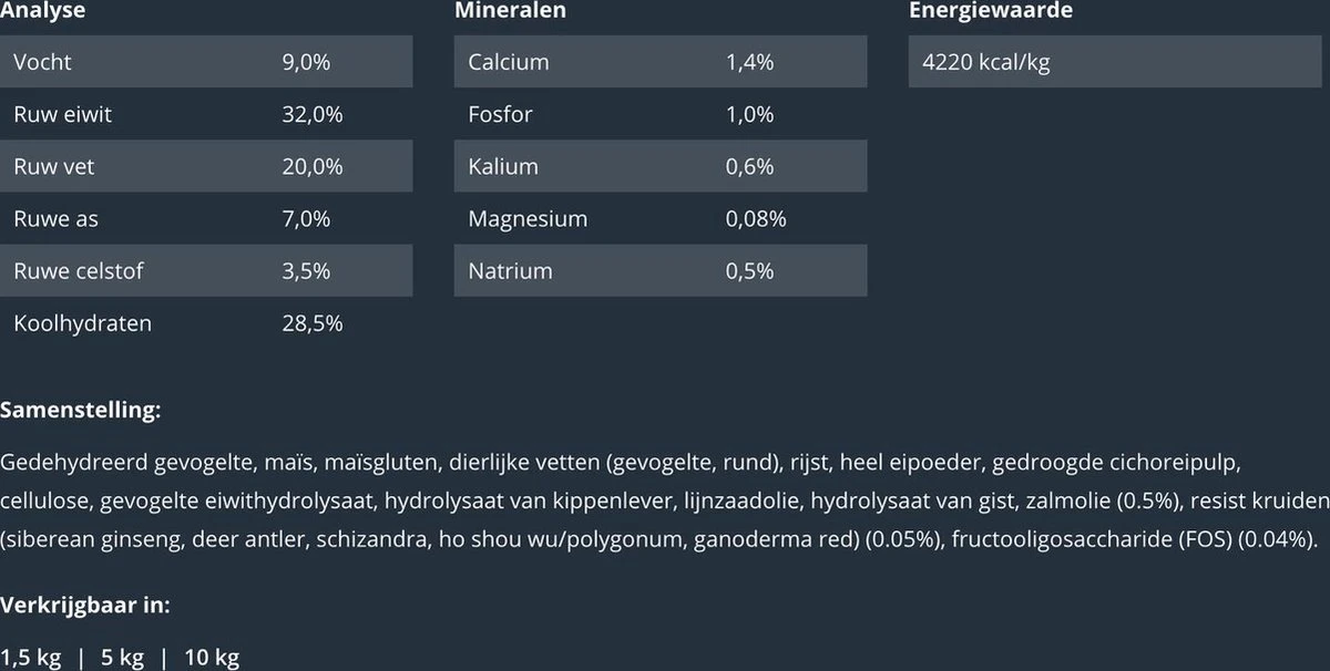 | Voedingswaarde | Gevogeltemeel, maïs, dierlijke vetten, maïsgluten, rijst, heel eipoeder, cichoreipulp, cellulose, caseïne, hydrolysaat van kippenlever, sojaolie, hydrolysaat van gist (bron van Manno-Oligo-Sachariden), zalmolie, Fructo-Oligo-Sacchariden (FOS), natuurlijke kruiden, lecithine |