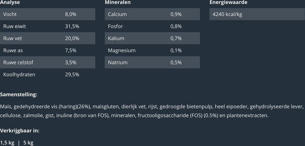 | Toevoegingsmiddelen | Calcium 0,9%Fosfor 0,8%Kalium 0,7%Magnesium 0,1%Natrium 0,5% |