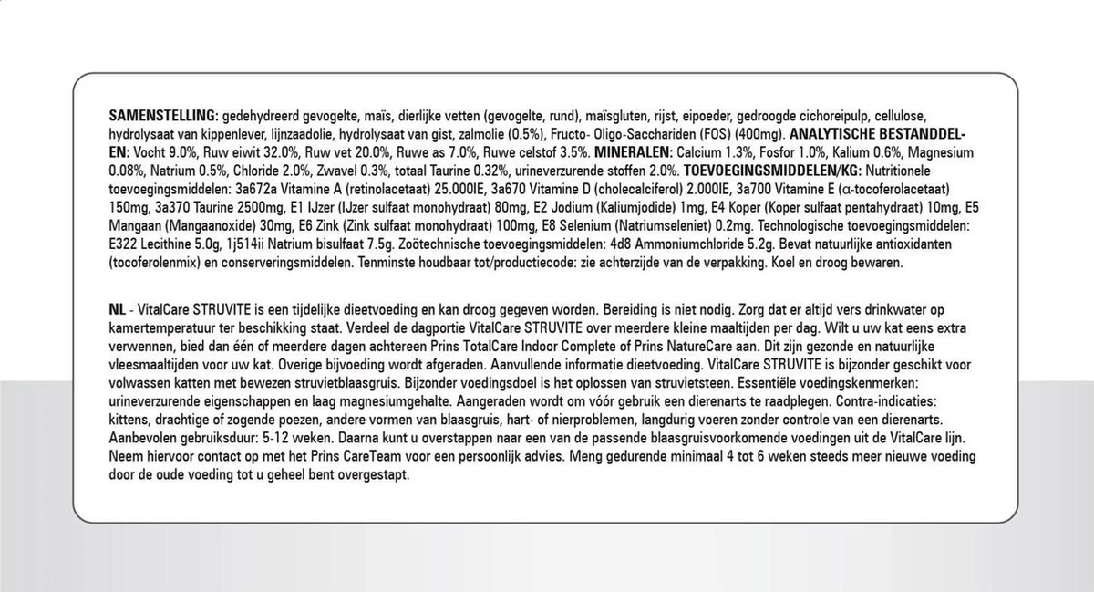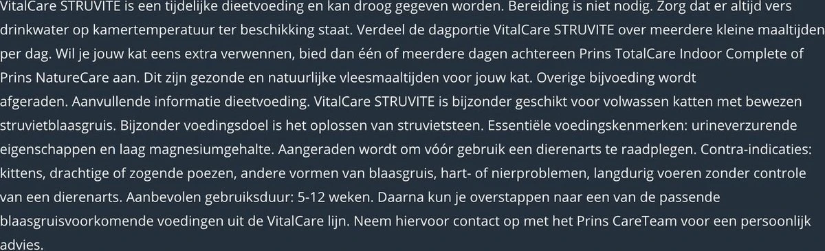 VitalCare STRUVITE is bijzonder geschikt voor volwassen katten met bewezen struvietblaasgruis. Het verlaagt de pH van de urine door urineverzurende eigenschappen en laag magnesiumgehalte en zorgt ervoor dat struviet kristallen bij de kat worden opgelost. U dient uw kat gedurende 5-12 weken VitalCare STRUVITE te voeren om herhaalde struvietvorming te voorkomen. Als bij controle door de dierenarts na deze periode het blaasgruis is opgelost, kunt u overstappen op een blaasgruis voorkomende voeding. Alle VitalCare producten (behalve de VitalCare KITTEN) bevatten urineverzurende stoffen om blaasgruis te voorkomen. Meng gedurende minimaal 4 tot 6 weken steeds meer nieuwe voeding door de oude voeding tot u geheel bent overgestapt.