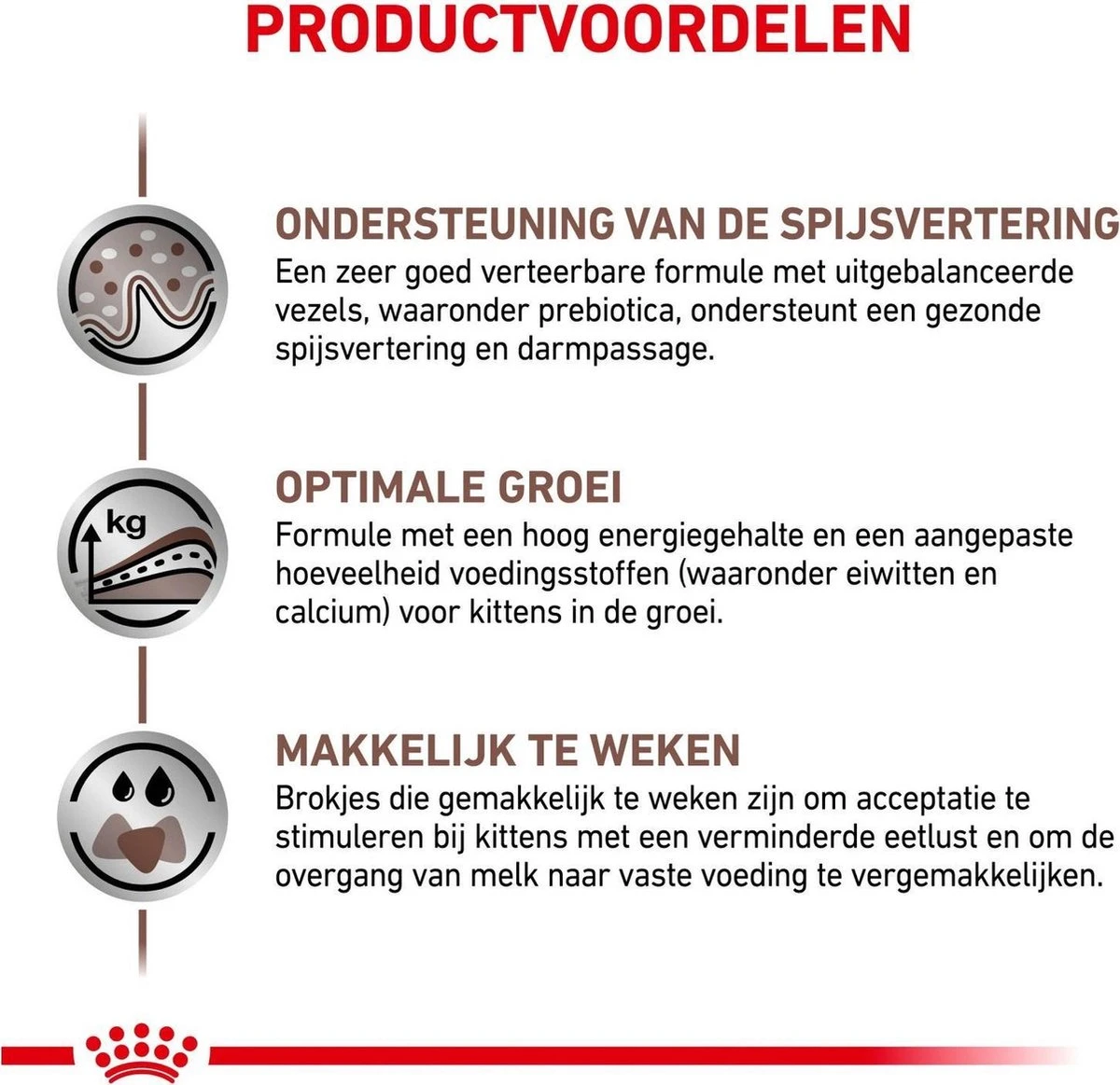 Kattenvoer ter ondersteuning van de spijsvertering van kittens tot 12 maandenGastrointestinal Kitten is een kittenvoeding die de spijsvertering van kittens ondersteunt. Zo bevat het goed verteerbare ingrediënten en een hoog gehalte aan essentiële voedingsstoffen. Deze voeding houdt tevens rekening met de groei, door aangepaste gehaltes eiwitten en calcium.