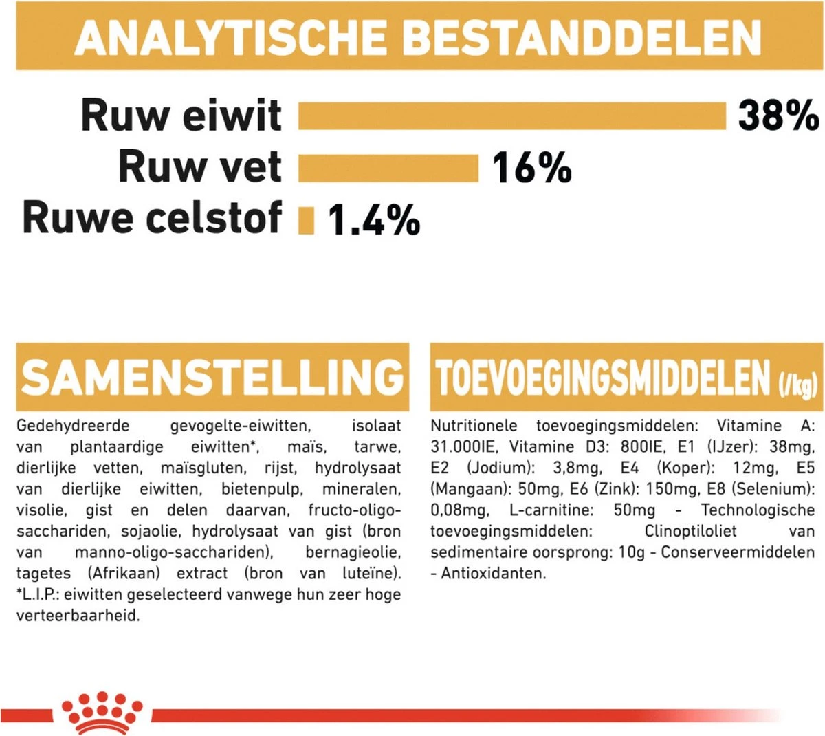 | Voedingswaarde | Samensteling: gedehydreerde gevogelte-eiwitten, isolaat van plantaardige eiwitten*, maïs, tarwe, dierlijke vetten, maïsgluten, rijst, hydrolysaat van dierlijke eiwitten, bietenpulp, mineralen, visolie, sojaolie, Fructo-Oligo-Sacchariden, gehydrolyseerde gist (bron van Manno-Oligo-Sacchariden), bernagieolie, tagetes (Afrikaan) extract (bron van luteïne) |