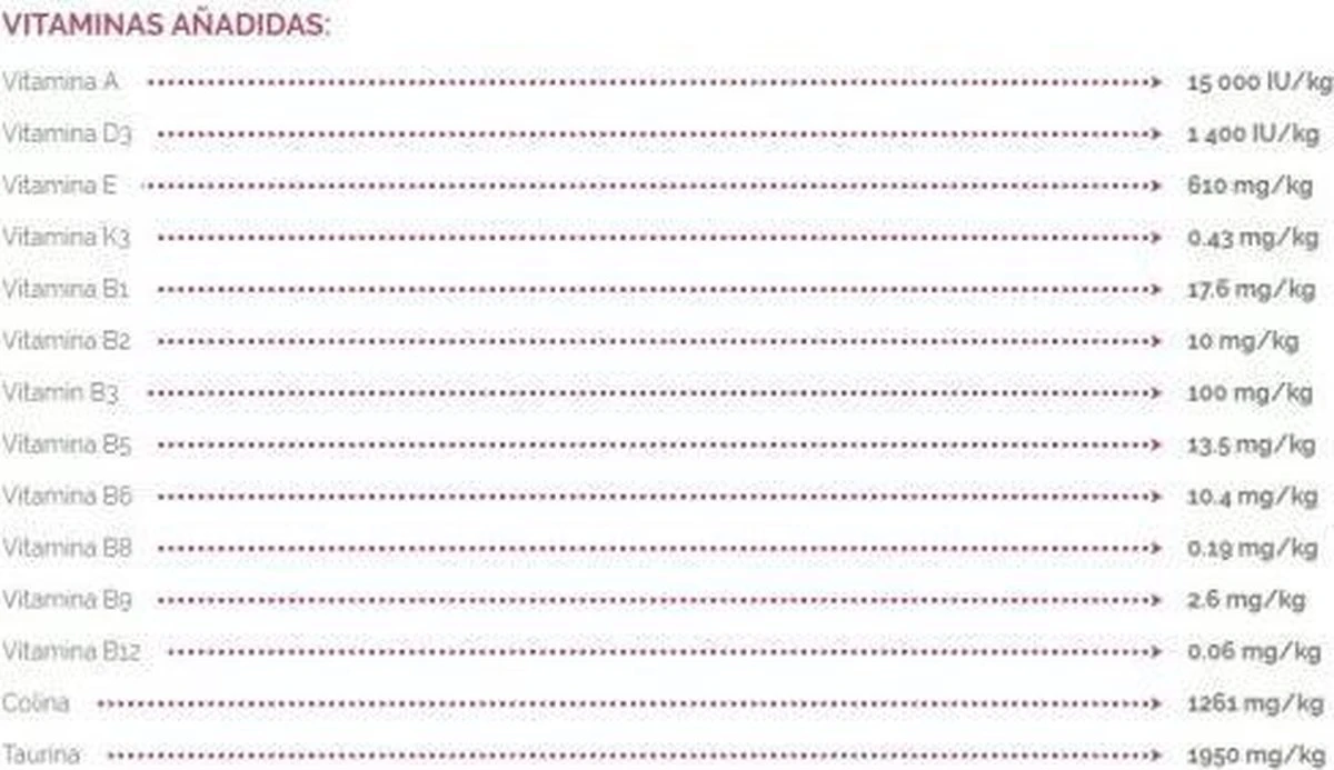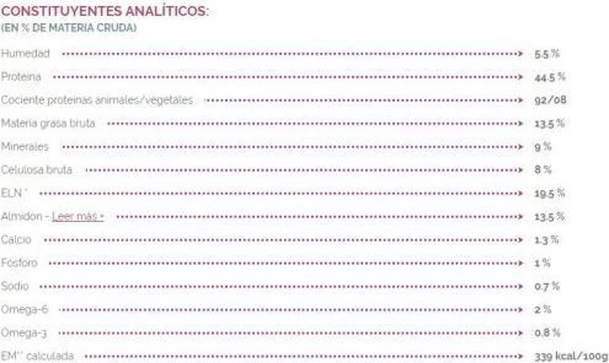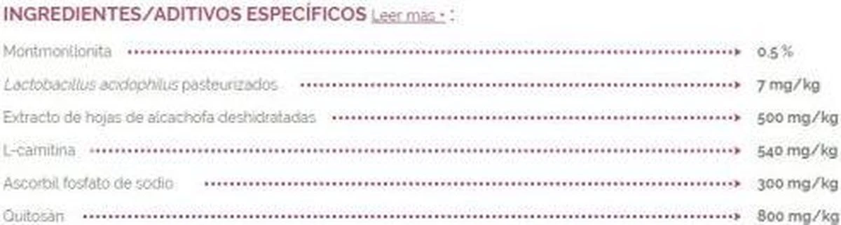 | Voedingswaarde | Gedehydreerd eiwit (varken en gevogelte), aardappelzetmeel<br />(min. 8 %), gehydrolyseerde dierlijke eiwitten, bonenpeulen,<br />hele erwten (min. 6 %), dierlijke vetten, lignocellulose,<br />minerale zouten, lijnzaad, bietenpulp, rijst, fructooligosacchariden,<br />psylliumvezels, chitosan, extract van<br />gedroogde artisjokkenbladeren, gepasteuriseerde Lactobacillus<br />acidophilus |