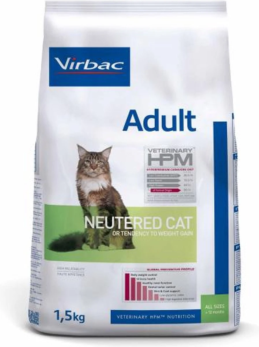 Adult Neutered Cat van HPM Veterinary is volledige voeding geschikt voor volwassen gesteriliseerde katten vanaf de leeftijd van 12 maanden. HPM Veterinary kattenvoeding is een nieuwe lijn gezondheidsvoeding van Virbac. HPM Veterinary zal uit uiteindelijk de gezondheidsvoeding van VetComplex vervangen.