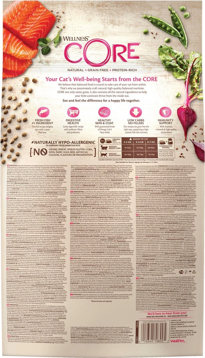 Wellness Core Kattenvoer Sterilised Zalm is een complete en evenwichtige natuurlijke kattenvoeding met verse zalm als hoofdingrediënt. Deze voeding is geschikt voor katten van alle leeftijden in alle formaten.